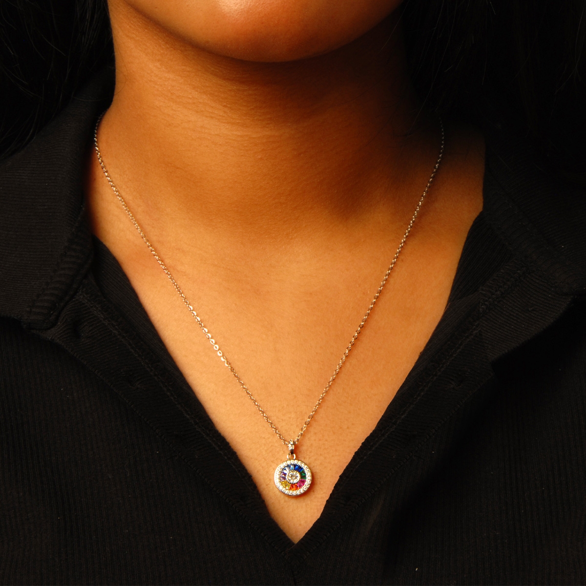 Bright and fresh fashion adds the perfect amount of confidence and fun to any outfit. Fifth Avenue Collection's "Blissful Colors" neckpiece exudes breezy style with a charming medallion of colorful AAA cubic zirconia baguettes surrounded by shimmering clear rounds on a fine 18" designer chain. Nickel and lead free jewellery.