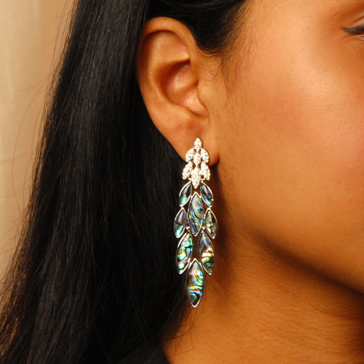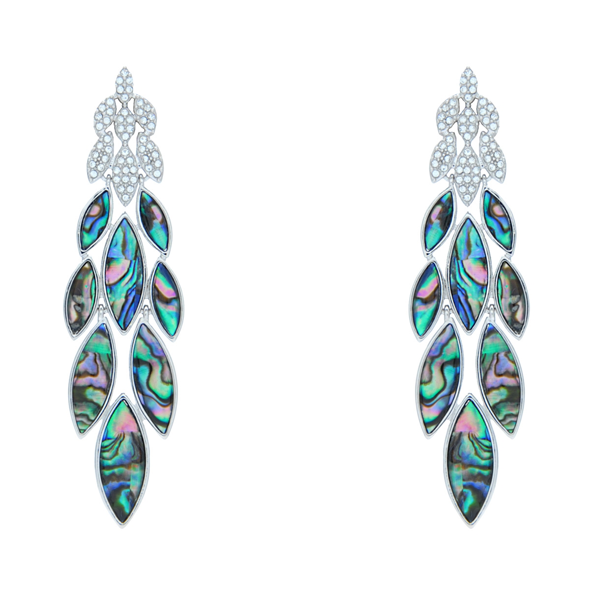 Create a "Flowing Statement" with this breathtaking pair of rhodium-finished chandelier style earrings! Genuine blue paua shell and Swarovski crystal create an elegant, lush look to give any outfit a rich and bold finish! Sterling silver posts. Nickel and lead free jewellery.