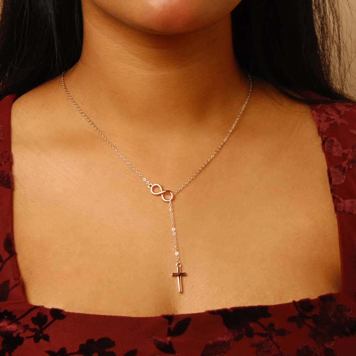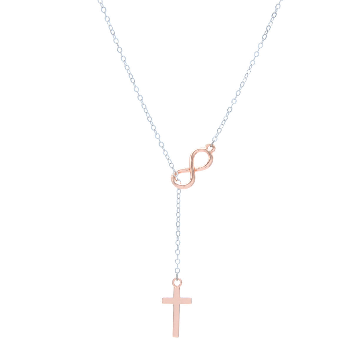 Make a statement of faith when you wear our stylish and sleek "Forever Divine" neckpiece. Flaunting a lariat style chain adorned with a smooth cross and infinity symbol, this two-tone design is both modern and meaningful. 18" neckpiece with 2" extension. Nickel and lead free jewellery.