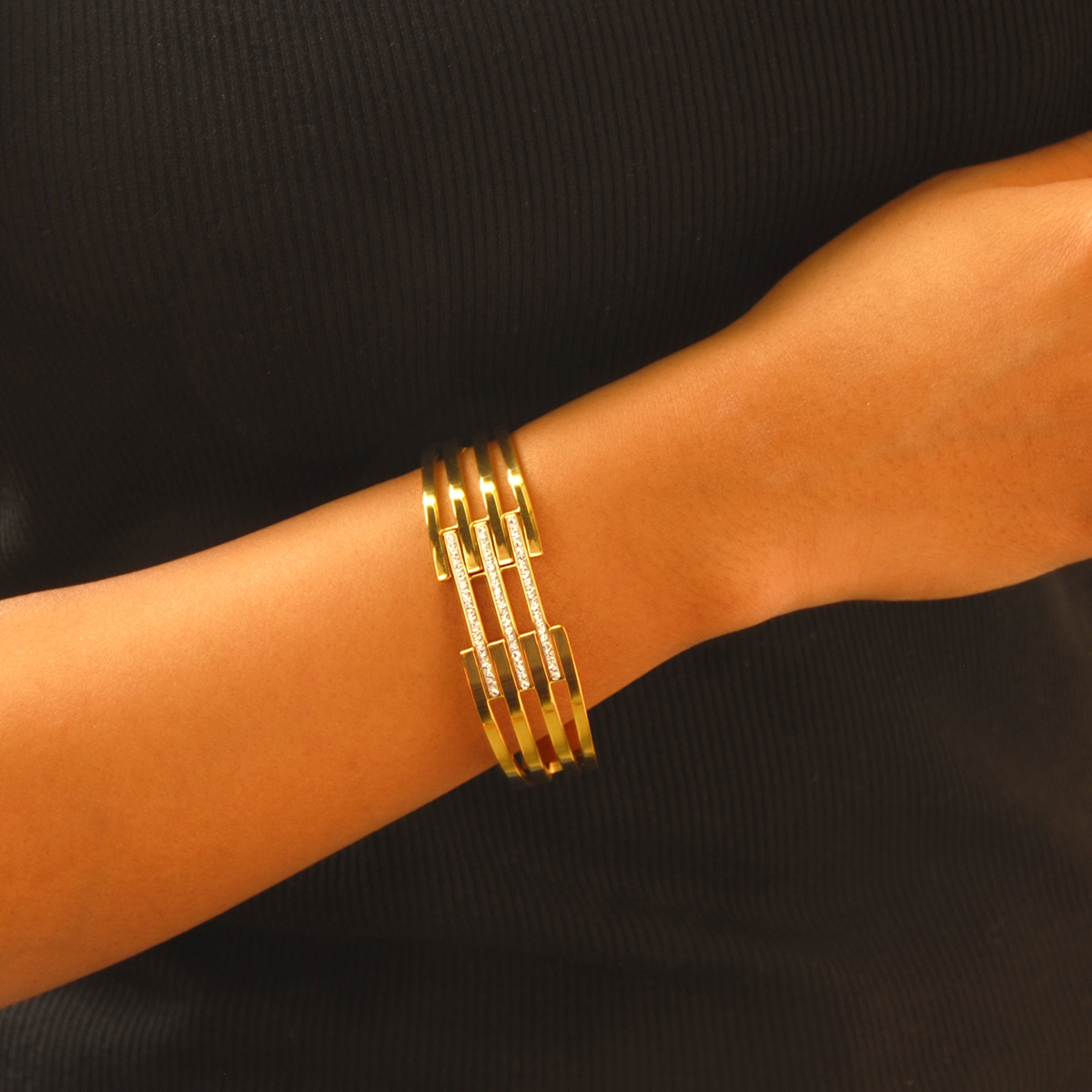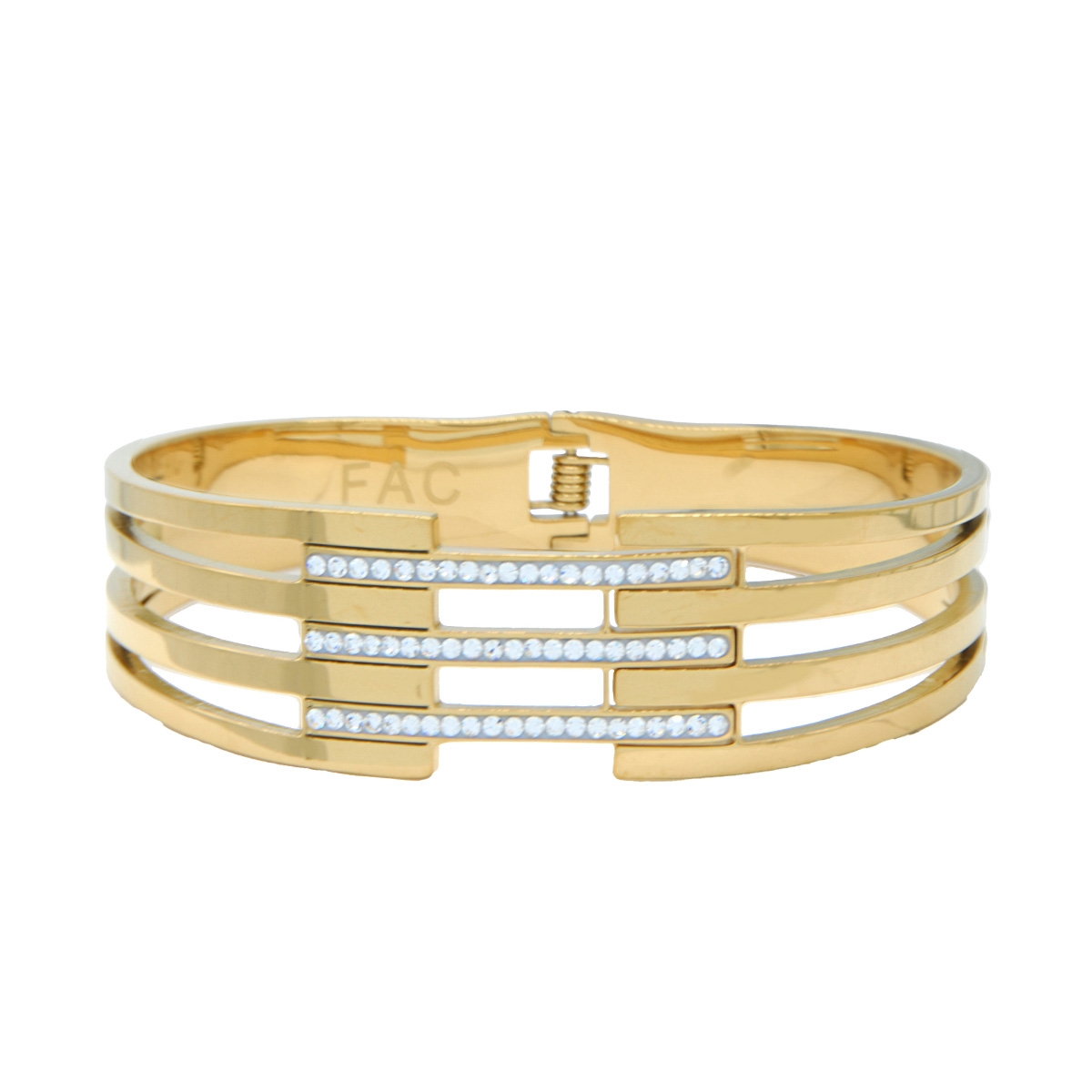Make an opulent addition to your coveted collection with our "Triple Luxury" bracelet. Featuring a rich gold finish and shimmering rows of Swarovski clear crystal, this easy-to-wear hinged cuff bracelet is sure to dazzle. Nickel and lead free jewellery.