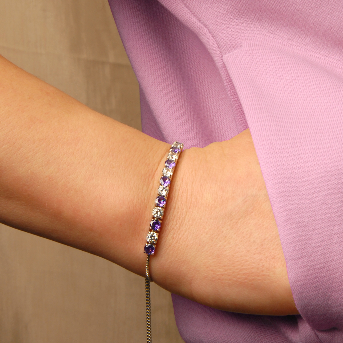Our lovely "Whimsical & Fine" bracelet flaunts stunning alternating purple and clear AAA cubic zirconia to create a timeless design that can be worn on its own or layered up to create a gorgeous arm candy stack! Easy-to-wear drawstring closure. Nickel and lead free jewellery.