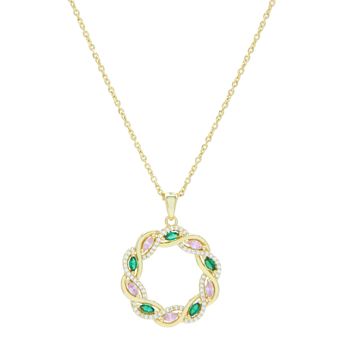 Rich and bold our "Woven Bliss" neckpiece showcases an exquisite circle of beautifully colored rose and emerald AAA cubic zirconia in a wreath design entwined with shimmering clears, suspended from a sleek 18" designer chain. Nickel and lead free jewellery.