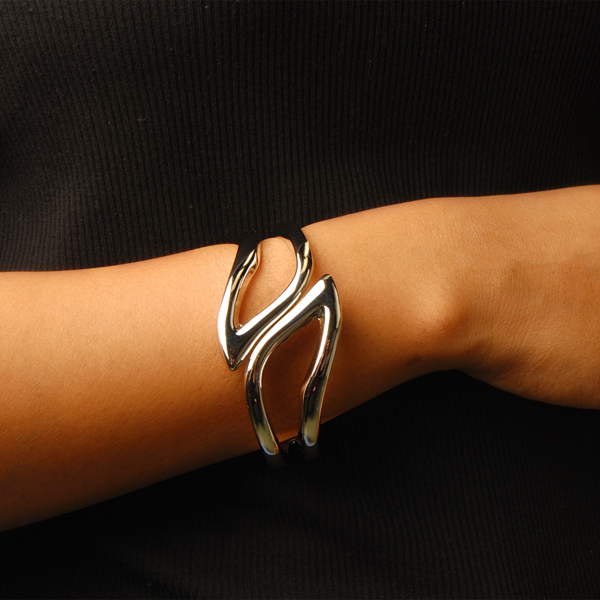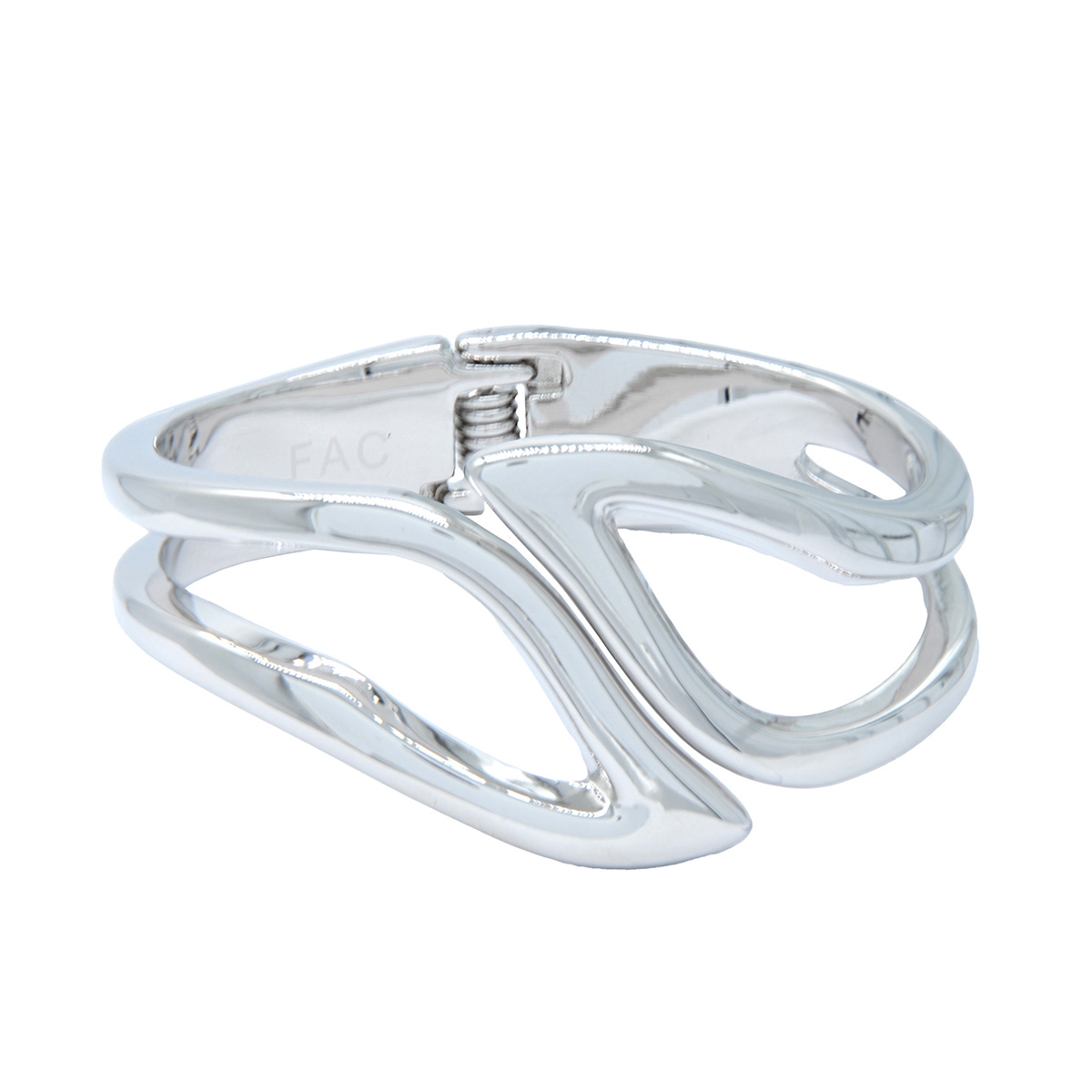 It's time to outshine with chic, original fashion! A smooth metallic finish arcs around this geometric-inspired, hinged cuff bracelet creating the perfect accent for any outfit. Nickel and lead free jewellery.