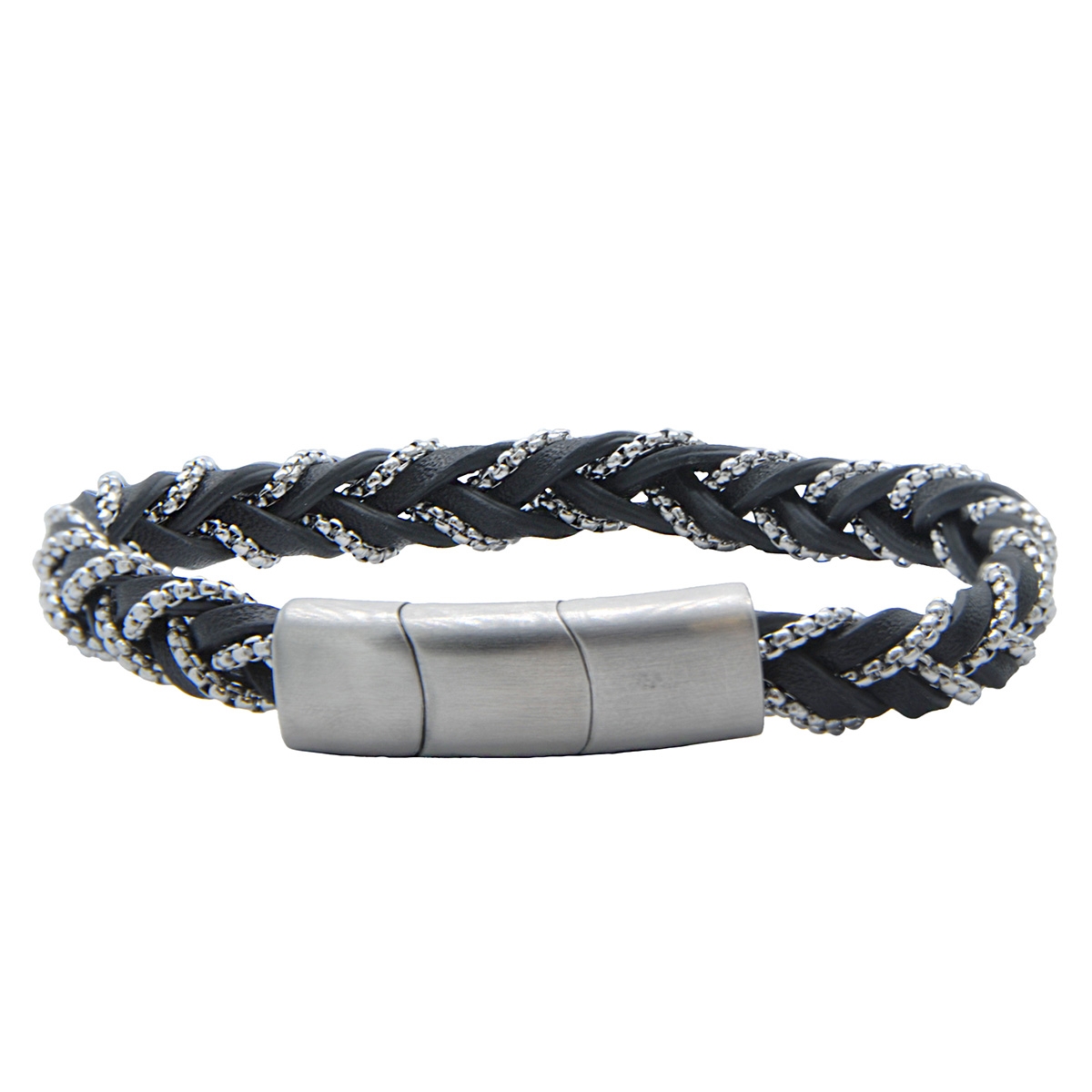 Giving casual masculine vibes, our "Chained Leather" bracelet boasts black leather beautifully weaved with sleek stainless steel chain. Easy to fasten magnetic closure. Nickel and lead free jewellery.