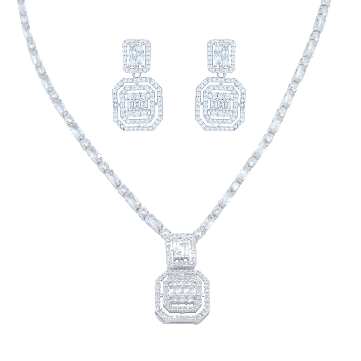 Our elegant and refined "Classic Affluence" set boasts a timeless design that will never go out of style. Featuring a stunning array of dancing clear AAA cubic zirconia, these luxurious fashion accessories will elevate your look with effortless ease. 17" neckpiece and stud earrings with sterling silver posts. Nickel and lead free jewellery.