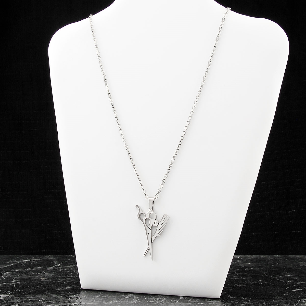 Perfect for any hair stylist our "Cut & Style" neckpiece flaunts a unique scissors and comb pendant. Finished in rich rhodium and adorned with a sparkling Swarovski crystal, this design will show off your sharp style. 24” neckpiece with 2” extension. Nickel and lead free jewellery.