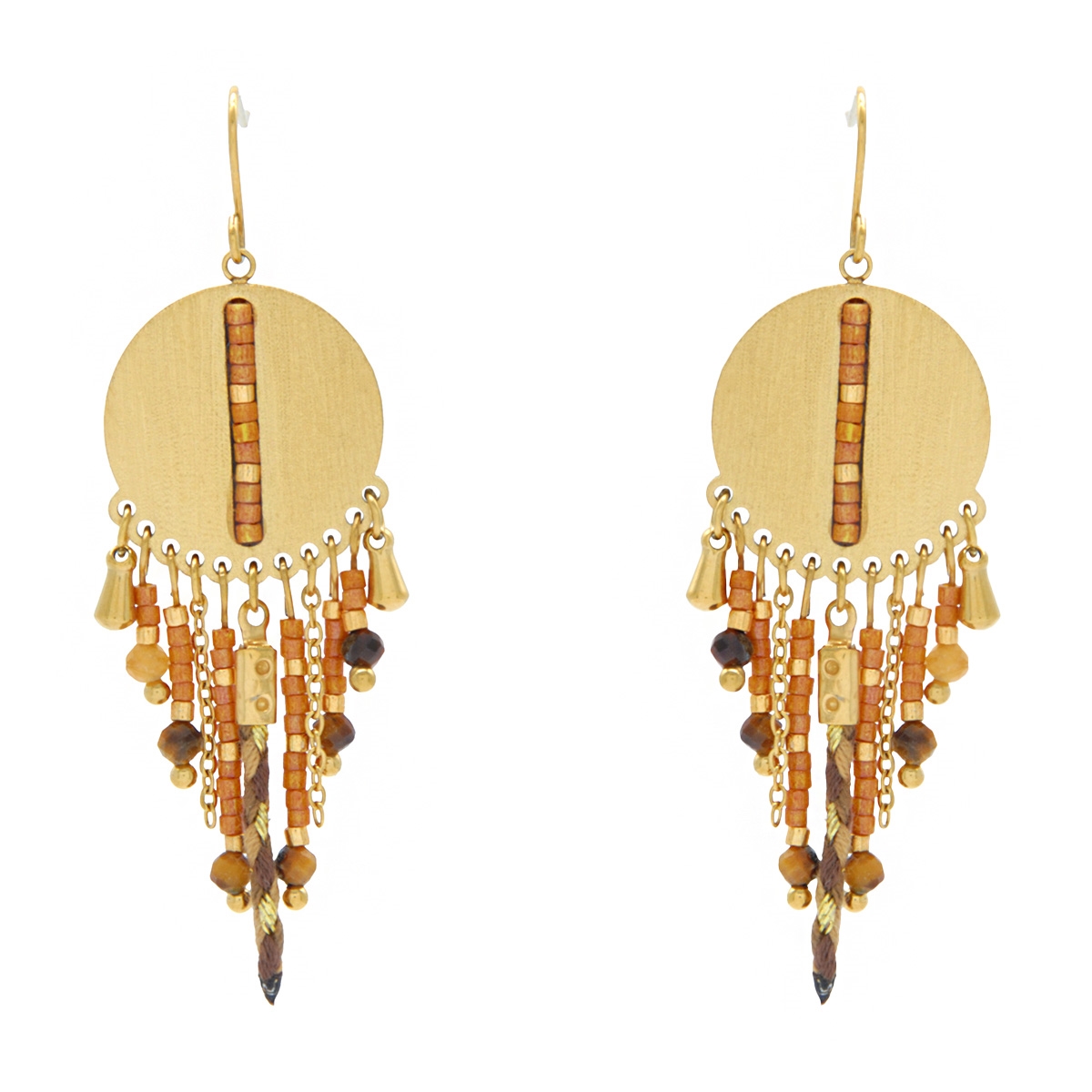 Our eye-catching "Ethnic Luxuries" earrings flaunt a stunning golden round adorned with a lustrous beaded center and dancing fringe. This statement design is sure to have a rich impact on your look! Sterling silver hooks. Nickel and lead free jewellery.