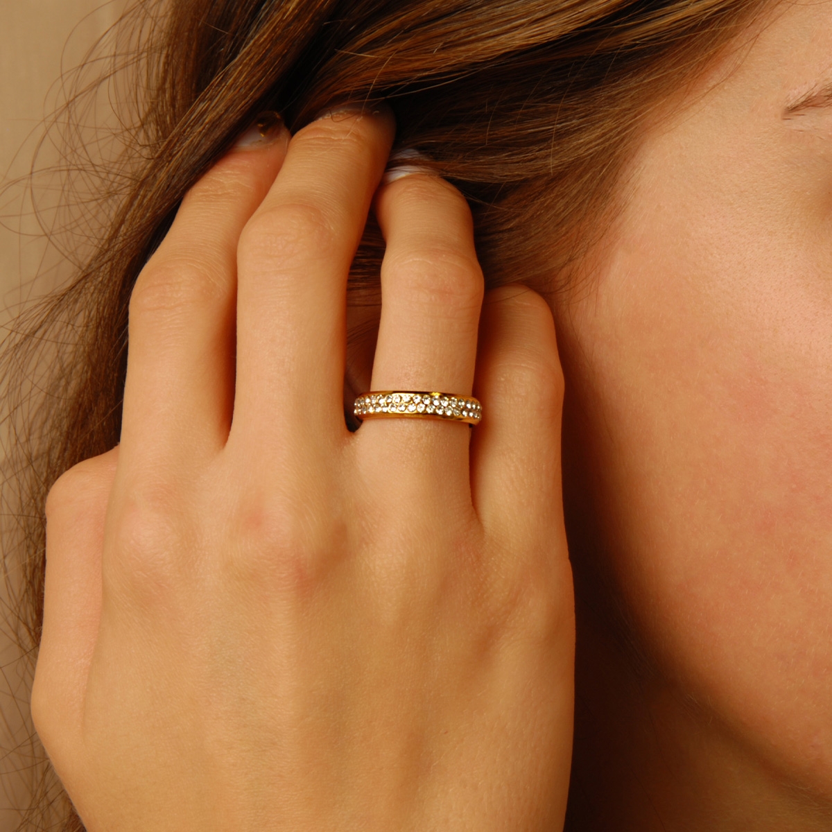 Sparkle from every angle when you wear our elegant "Everlasting Sparkle" ring. Flaunting a stunning eternity ring style design beautifully embellished with an array of Swarovski crystals, this must-have fashion accessory is perfect for stackable options or when worn individually. Sterling silver band finished in gold. Nickel and lead free jewellery.