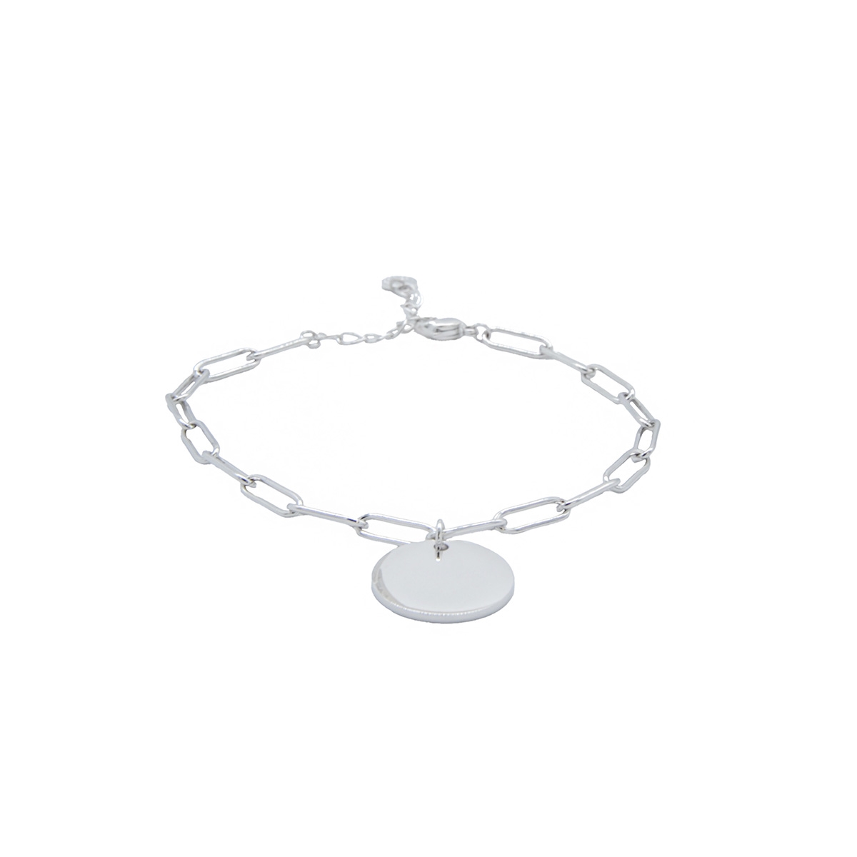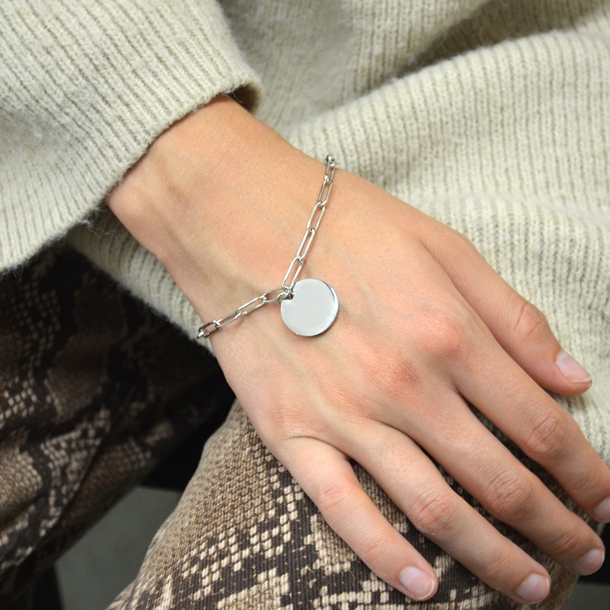 Fifth Avenue Collection is proud to release our new personalized line of jewellery. This trendy paperclip chain bracelet accompanied by a smooth medallion pendant with a space on the front for engraving is guaranteed to be a treasured everyday favorite. ** Using your orders special instructions section, please include the name or word you would like engraved (max one line and 8 characters) along with the font. For example: Madison, font c. Engraving included in the price. Stainless steel. Nickel and lead free jewellery.