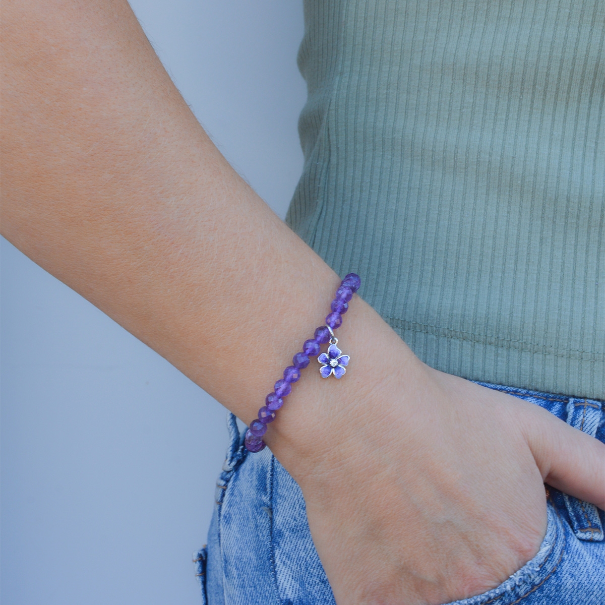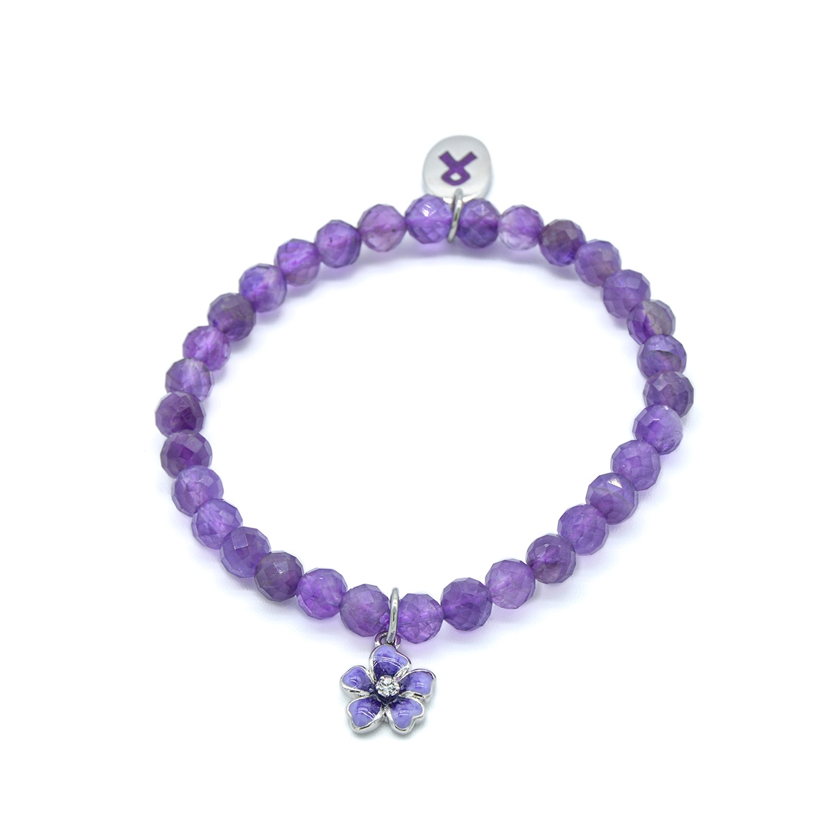 This gorgeous stretch bracelet features rich purple European glass faceted beads, accented with a charming hand-painted enamel flower with a sparkling clear Swarovski crystal center, and a purple ribbon, symbolizing support and awareness for those affected. Nickel and lead free jewellery.