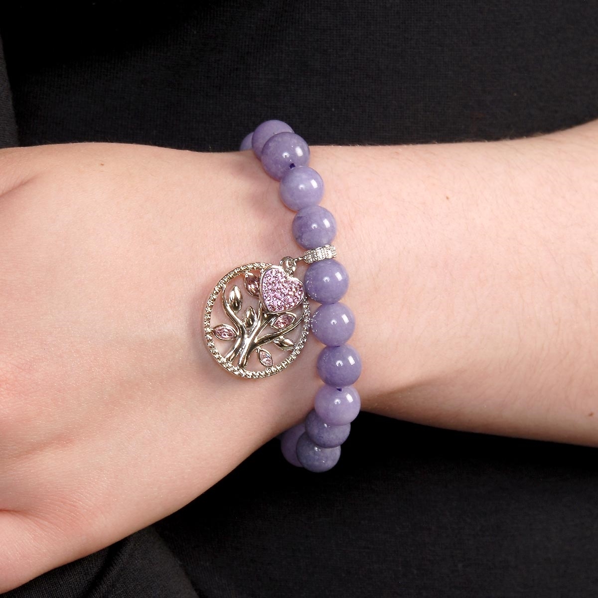 This beautiful stretch bracelet features smooth purple genuine agate beads centered with a rich rhodium finished roundel encrusted with AAA cubic zirconia. Two enchanting charms adorned with light amethyst Swarovski crystal complete this lovely design. Nickel and lead free jewellery.