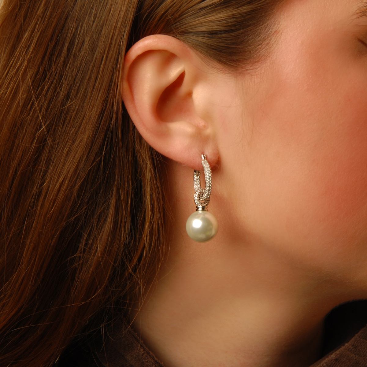 Classic romance with a twist, our "Fancy & Pearls" earrings showcase exquisite hoops of glamorous sparkling AAA cubic zirconia accompanied by stunning pearl drops. Sterling silver posts. Nickel and lead free jewellery.