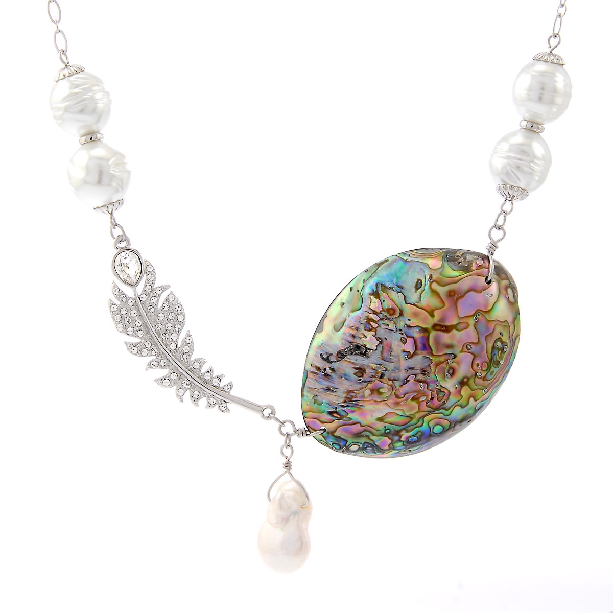Bring instant sophistication and elegance to your look when you wear our "Fashion Fierce" neckpiece. This fashion forward accessory flaunts a stunning feather Swarovski crystal studded pendant with sensational abalone shell and classic mother of pearl suspended from sleek 20" designer chain to create a legendary Fifth Avenue Collection design. Nickel and lead free jewellery.