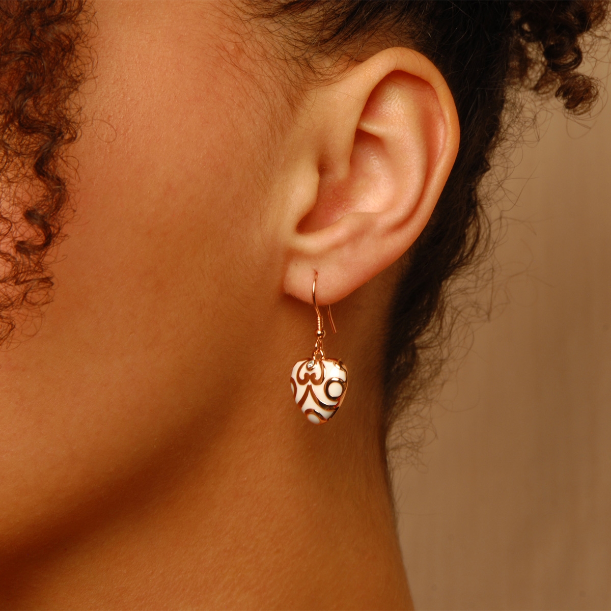 Feel the love when you wear our beautiful "Hearts & Swirls" earrings. Featuring smooth white hand-painted enamel, swirls finished in rich rose gold and a sparkling Swarovski crystal. Earrings with sterling silver hooks. Nickel and lead free jewellery.