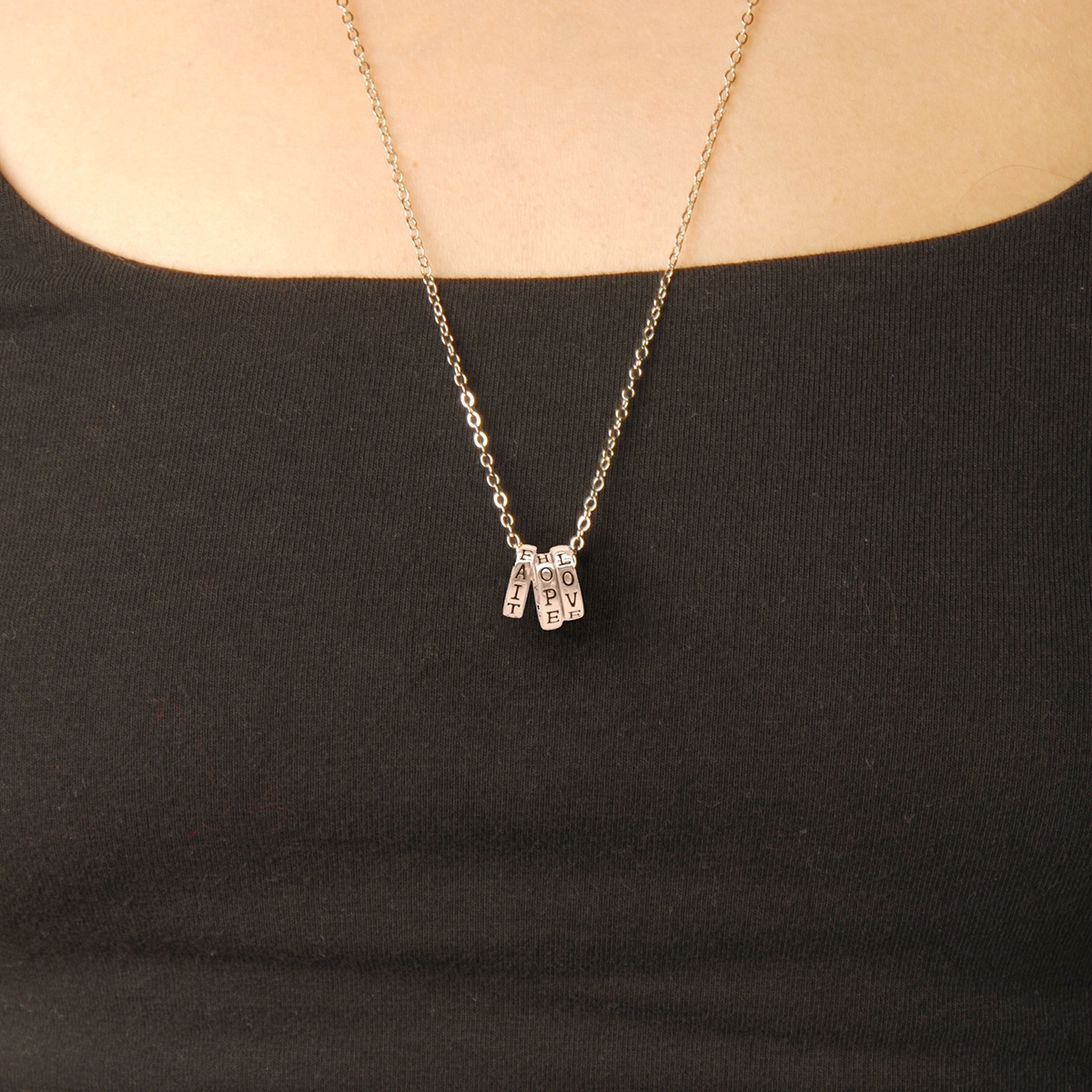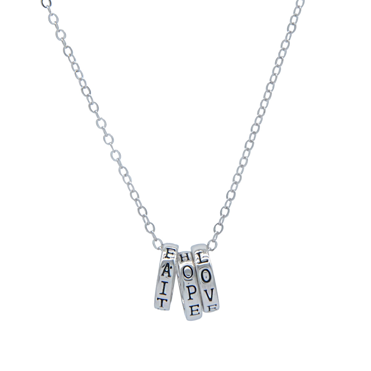Feel inspired when you wear our on-trend "Love, Hope & Faith" neckpiece featuring three charming engraved rings on a sleek 24" designer chain. Nickel and lead free jewellery.