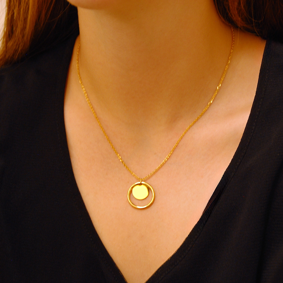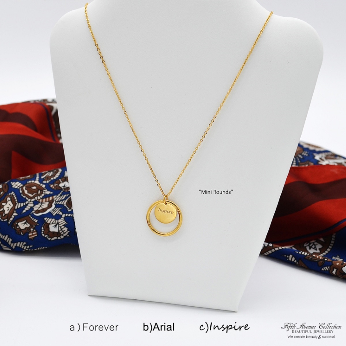 Showcasing rich curves, feminine style and the option to personalize your design, our "Mini Rounds" stainless steel neckpiece finished in gleaming gold is the perfect trend-right style.