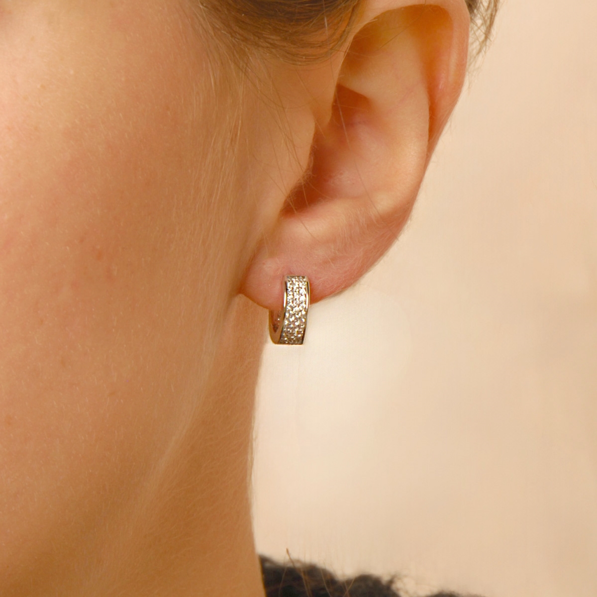 Dainty yet stunning, our "Petite Luxe" huggie hoop earrings feature a triple row of sparkling cubic zirconia that will add the perfect finishing touch to your look. Sterling silver posts. Nickel and lead free jewellery.
