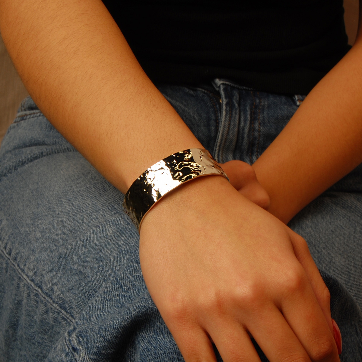Bold and chunky, our stunning "Timeless Cuff" bracelet boasts beautifully hammered texture detailing. This rich open-cuff design is sure to become part of your signature style for years to come. Nickel and lead free jewellery.