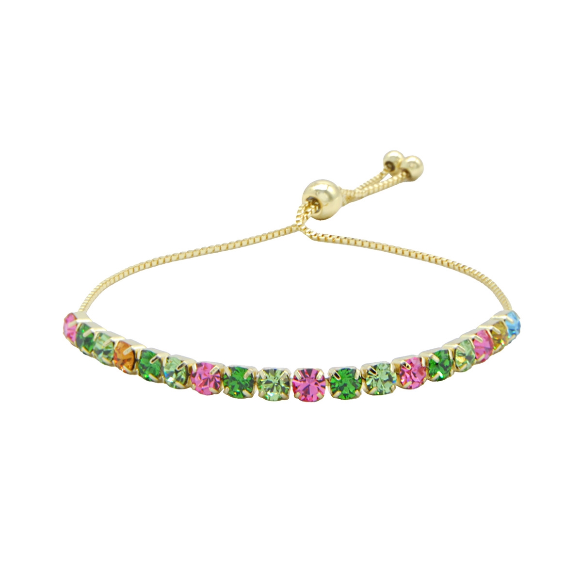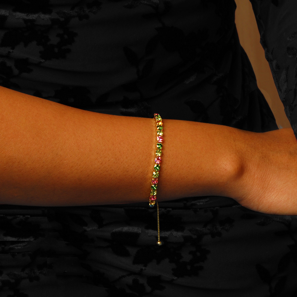 Undeniably beautiful our "Vibrant Dazzle" bracelet boasts a breathtaking combination of bold multicolor Swarovski crystal on a sleek adjustable drawstring chain bracelet. You are sure to leave onlookers mesmerized when wearing this colorful fashion accessory. Nickel and lead free jewellery.