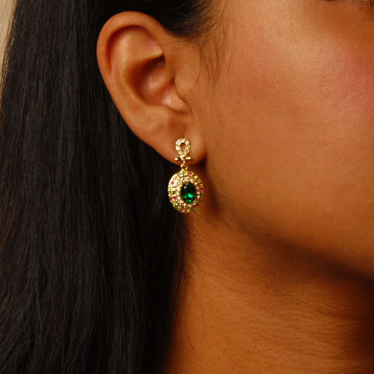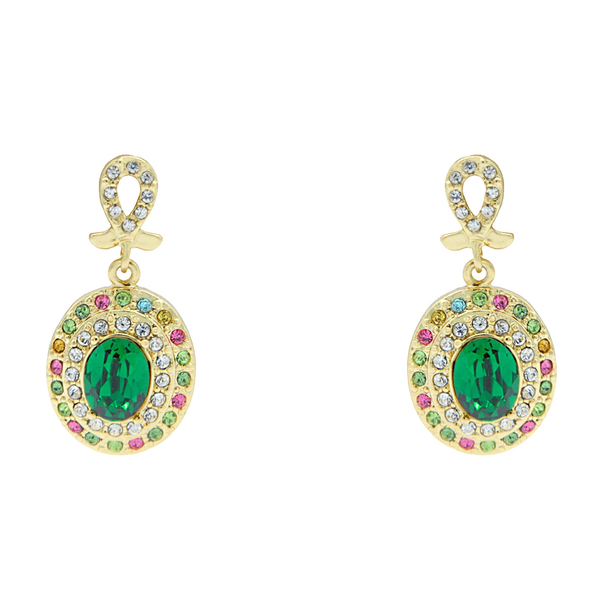 Undeniably beautiful our "Vibrant Dazzle" earrings boast a breathtaking green oval surrounded by tiny clear and bold multicolor Swarovski crystals. You are sure to leave onlookers mesmerized when wearing these colorful, ornate fashion accessories. Sterling silver posts, Nickel and lead free jewellery.