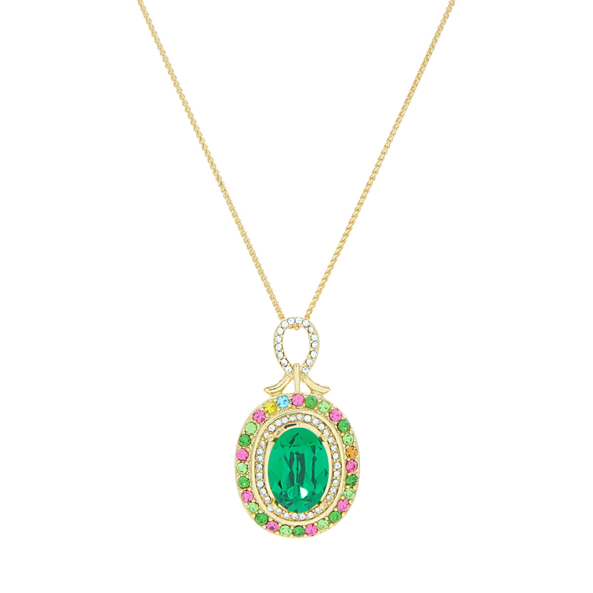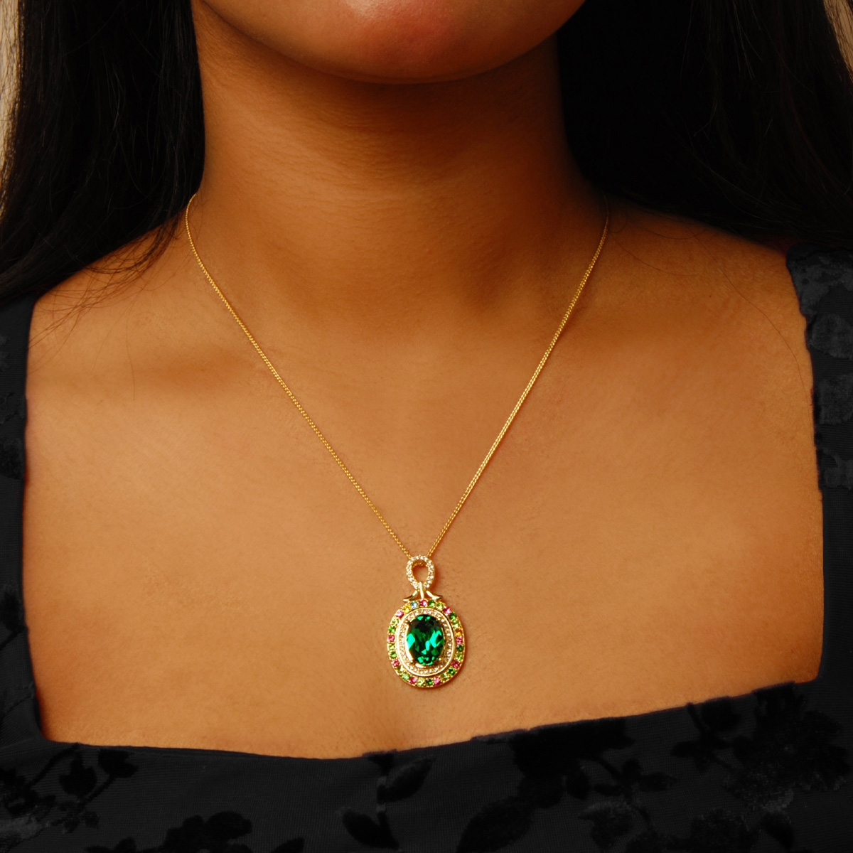 Undeniably beautiful our "Vibrant Dazzle" neckpiece boasts a breathtaking green oval surrounded by tiny clear and bold multicolor Swarovski crystals suspended from a sleek 18" chain. You are sure to leave onlookers mesmerized when wearing this colorful, ornate fashion accessory. Nickel and lead free jewellery.